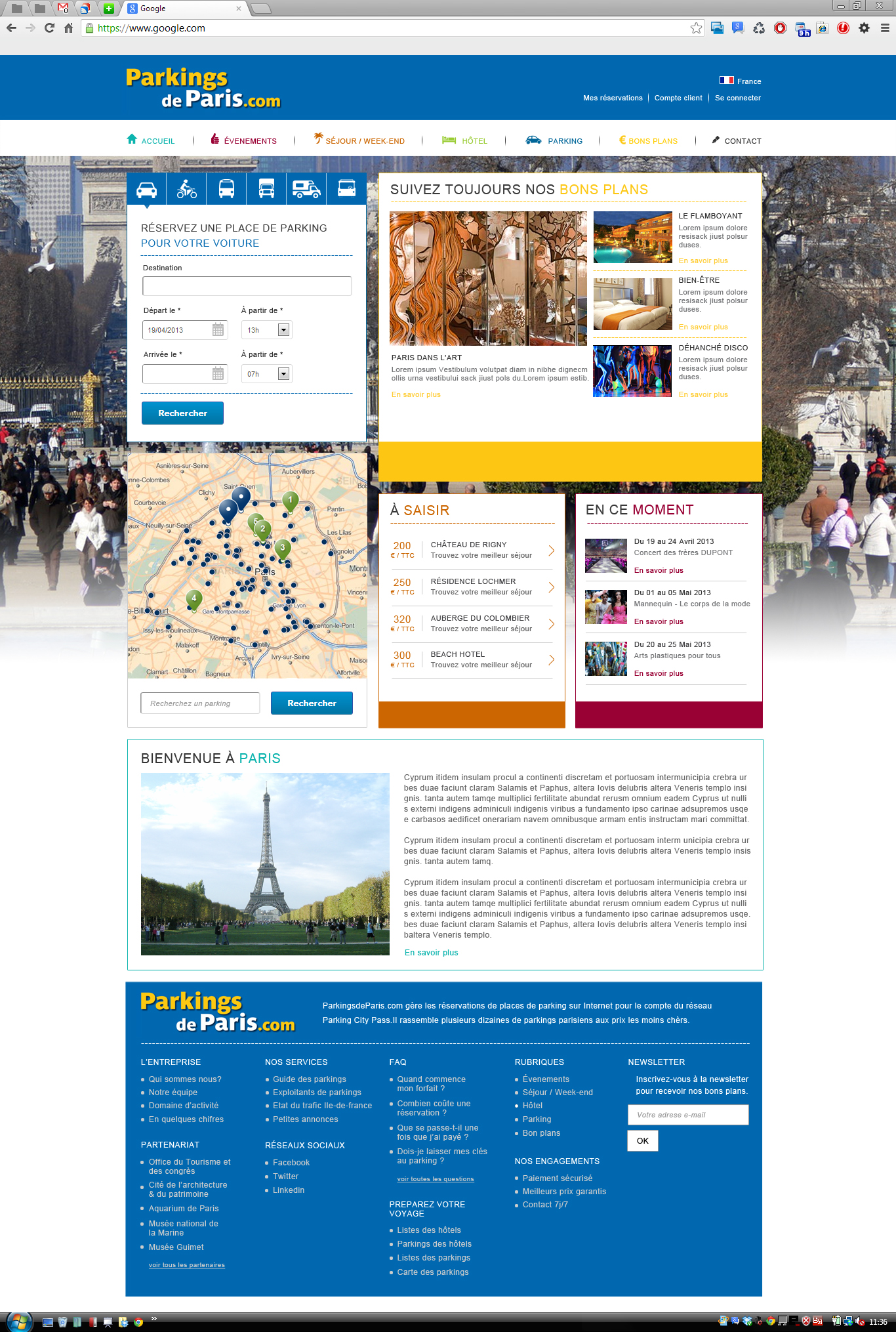 La société Parking De Paris voulait refaire la refonte de leur site web. Selon un cahier d'echarge fourni, j'ai réalisé le template suivant. Il voulait un site qui ne propose pas que des places de parkings, que les internautes ou leurs fidèles clients puissent etre informer des news, des bons plans, parfois de séjours dans la capitale et ou ailleurs.